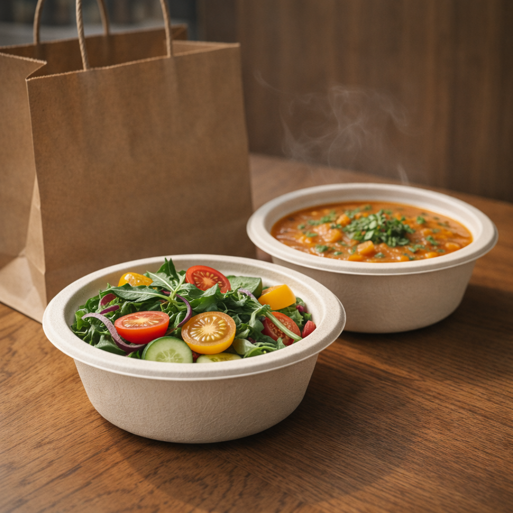 Fabricado en fibra de caña de azúcar, resistente a líquidos y alimentos calientes.